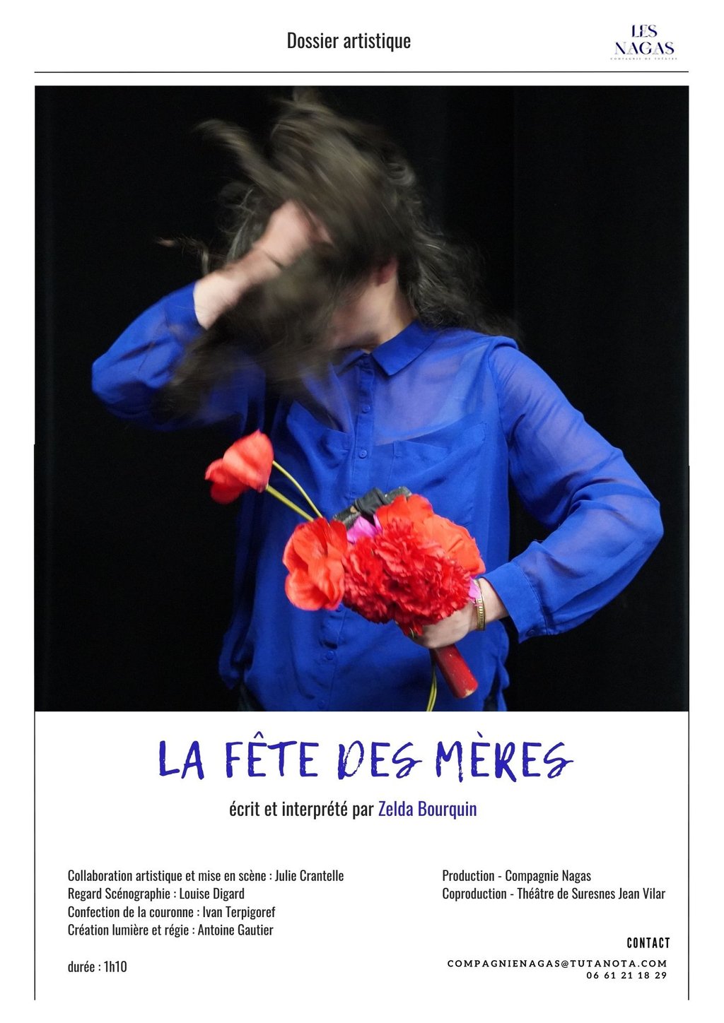 La fête des mères est un seul en scène écrit, interprété et mis en scène par Zelda Bourquin. En jouant avec les codes du spectacle d'enfant et l'imaginaire de cette fête populaire, Zelda Bourquin explore les manières d'inventer sa propre célébration pour répondre à la tristesse mystérieuse de sa propre mère. Elle mêle ainsi la fable et la performance en jouant de façon ludique avec cette ambiguïté : la mère de l'artiste est-elle dans la salle ? Ce spectacle qu'elle lui offre, et lui a offert, a-t-il permis de la sortir de la souffrance ? Le théâtre peut-il accomplir ce que la jeune femme n'a pas pu accomplir ?